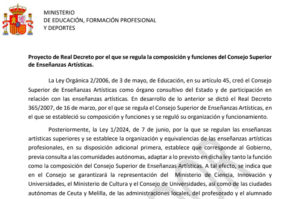 Nos preocupa que el borrador actual perpetúe una estructura desequilibrada y obsoleta, que no refleja la diversidad ni la riqueza del ecosistema artístico español. Por ello, apelamos a la responsabilidad institucional para impulsar una reforma que incorpore realmente a quienes enseñan, aprenden, crean y hacen posible la vida cultural. La anunciada como «Ley educativa con más consenso de la historia» no se puede olvidar en su desarrollo de gran parte del ecosistema cultural.